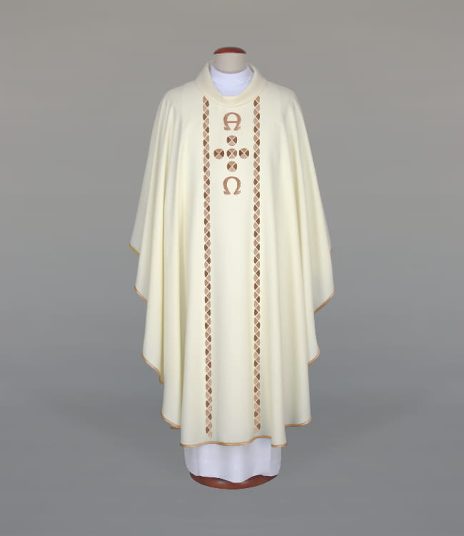Ornat w kolorze ecru z ozdobnym haftem Alfa i Omega, wykończony lamówką. Kołnierz typu golf.