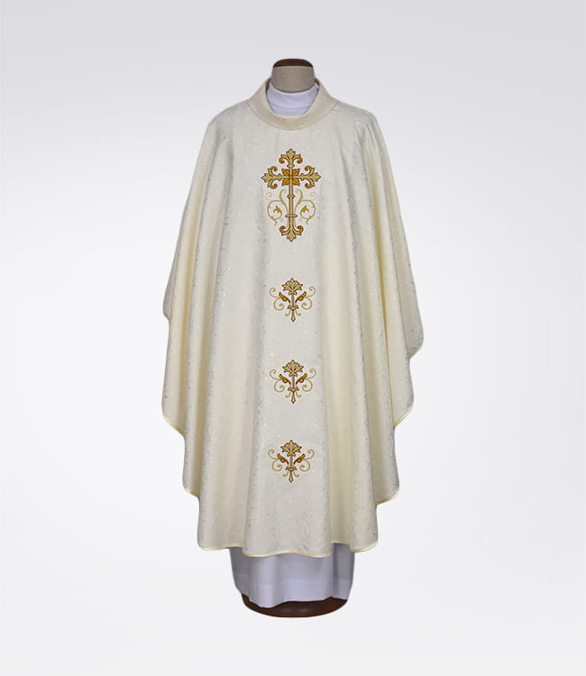 Ornat przygotowany z dużą starannością i dbałością o szczegóły, z przewiewnej tkaniny adamaszkowej.