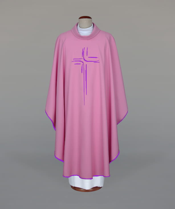Ornat w kolorze różowym, wykończony fioletową lamówką.