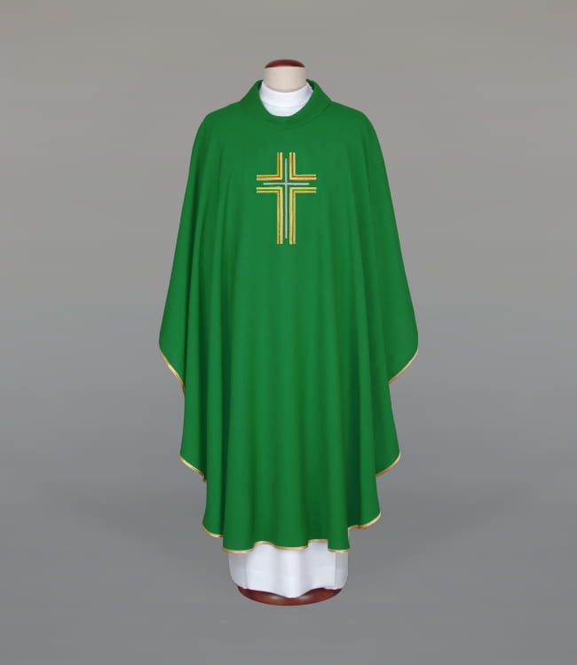 Ornat zdobiony nowoczesnym, wypukłym haftem, wykończony złotą, brokatową lamówką. Kołnierz typu golf.