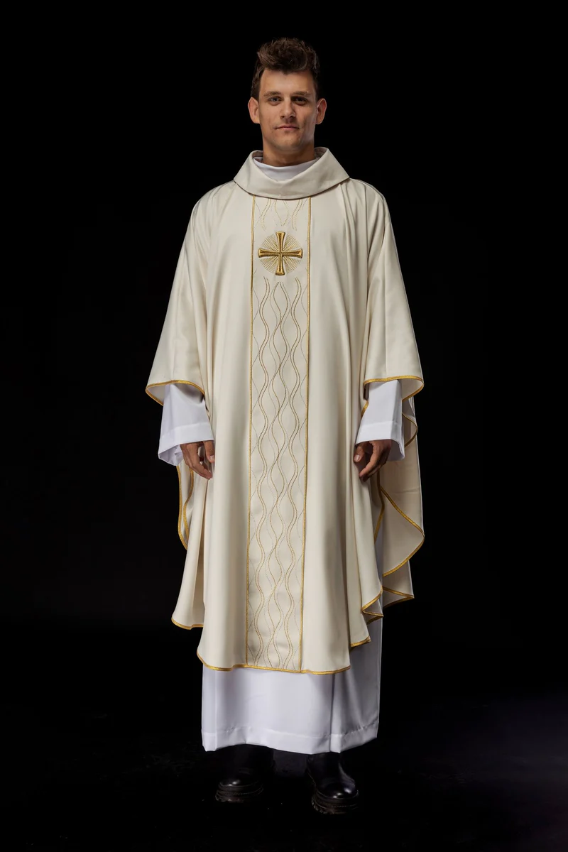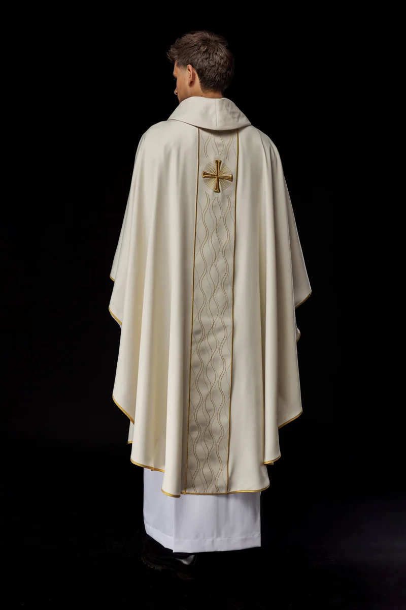 Szata liturgiczna wykonana z wysokiej jakości, gładkiej tkaniny, ozdobiony bogatym haftem z symbolem krzyża.