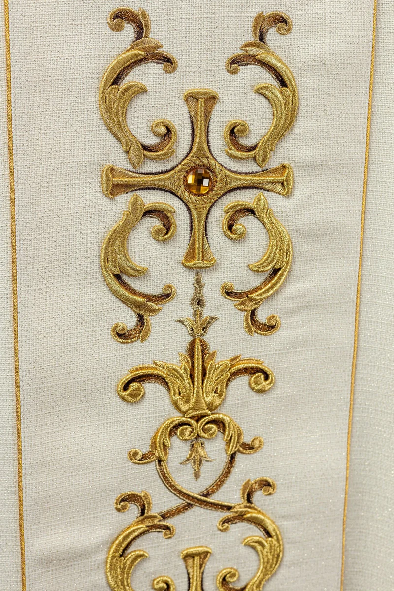 Szata liturgiczna wykonana z wysokiej jakości tkaniny gładkiej, zdobiony pasem z haftowanym wizerunkiem.