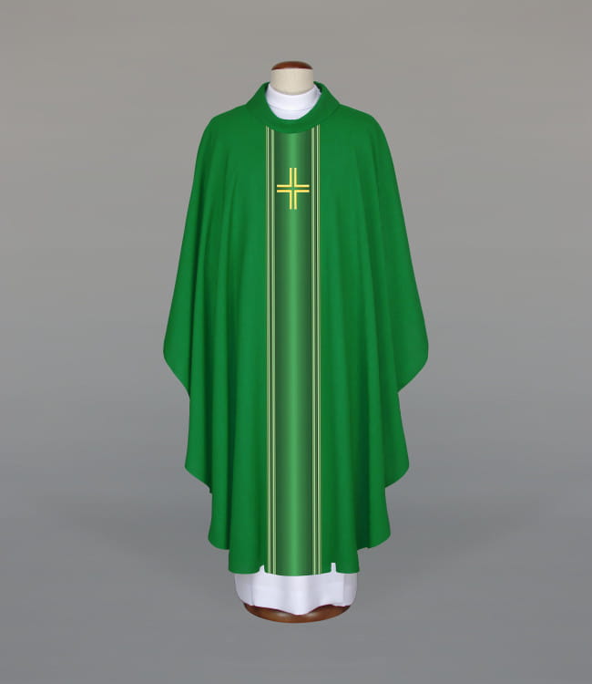 Ornat zdobiony nowoczesnym, wypukłym haftem, na ozdobnym pasie. Kołnierz typu golf. Ornat wykonany z lekkiej, przewiewnej tkaniny. Stuła wewnętrzna w komplecie. Szata dostępna również w innych kolorach liturgicznych.