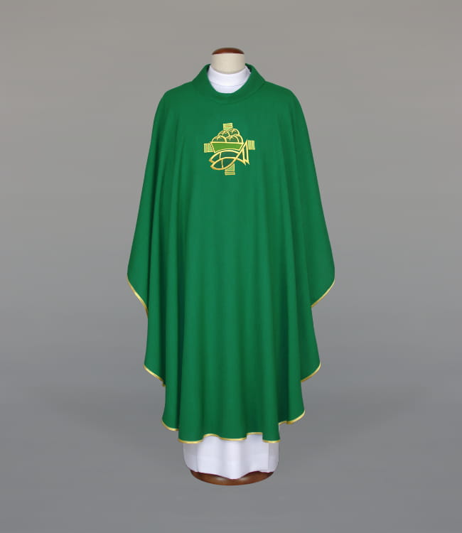 Ornat w kolorze zielonym zdobiony haftem w postaci ryb na tle krzyża, wykończony złotą, brokatową lamówką.
