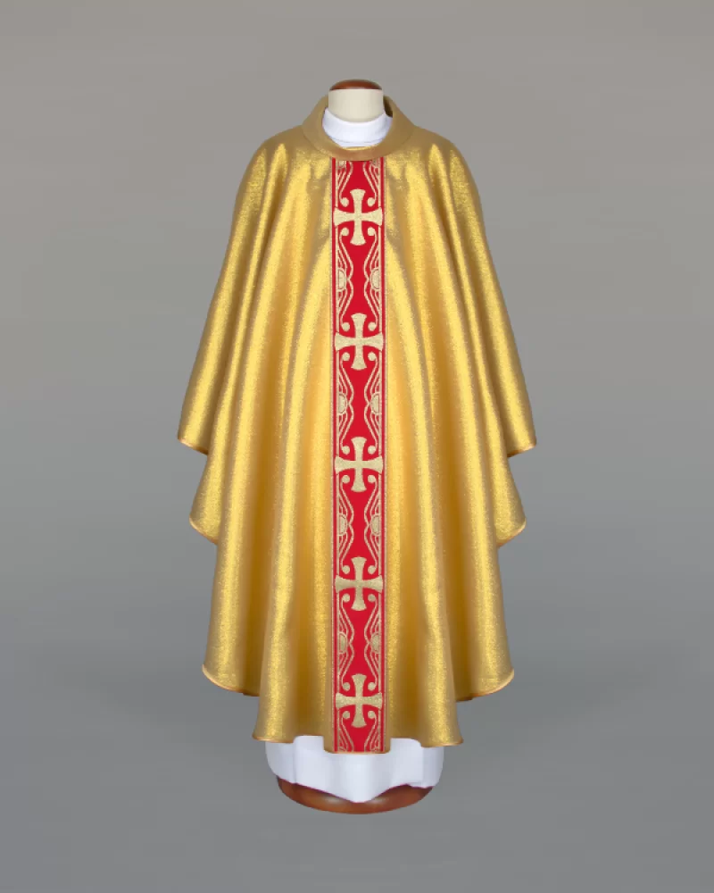 Ornat wykończony złotą, brokatową lamówką. Kołnierz typu golf, stuła wewnętrzna w komplecie.
