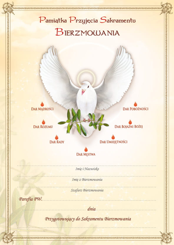 Druk na papierze kredowym, miejsca na których można umieścić informacje dotyczące Bierzmowanego,