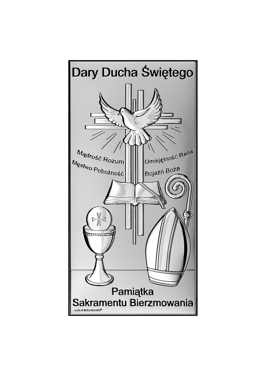 Dary Ducha Świętego - obraz posrebrzany renomowanego włoskiego producenta Beltrami dedykowany jako pamiątka przyjęcia sakramentu bierzmowania. Obrazek z możliwością postawienia i powieszenia.