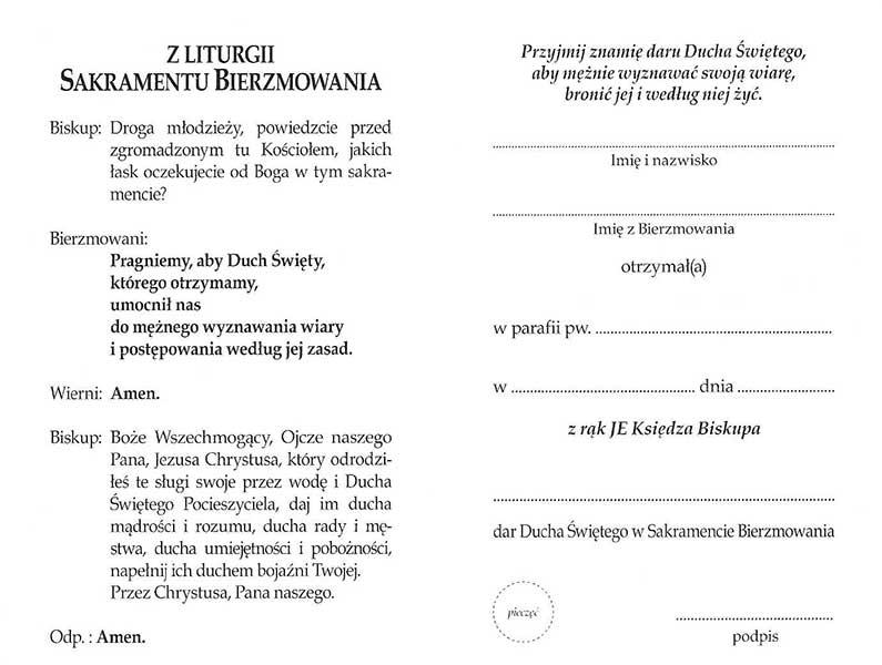 Składana pamiątka, z miejscem na dane bierzmowanego oraz nazwisko księdza biskupa i katechety przygotowującego do sakramentu.