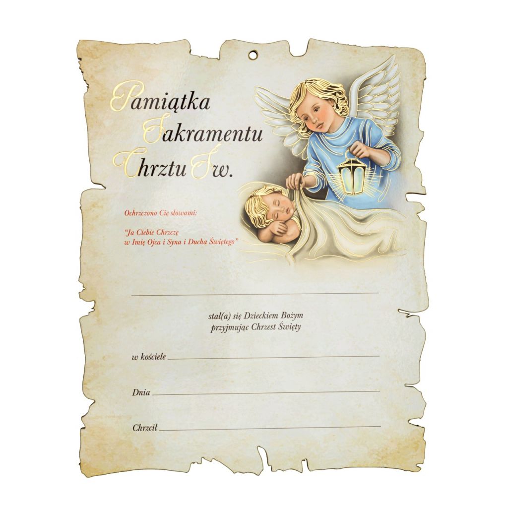 Pamiątka sakramentu chrztu świętego w formacie 18.2 x 23 cm na sklejce o grubości 4 mm.