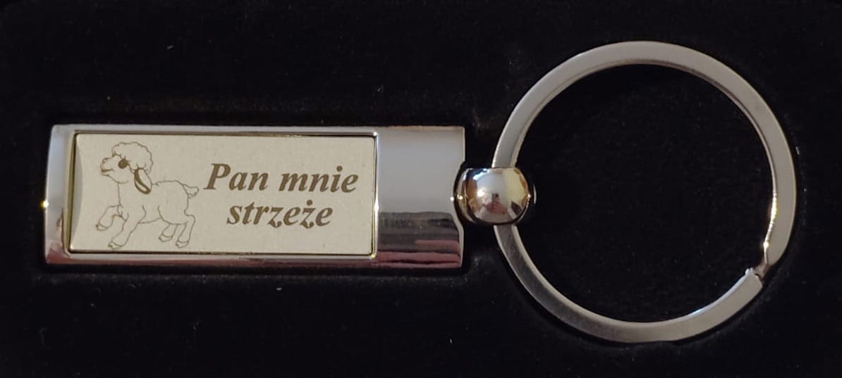 Breloczek metalowy z grawerowanym obrazkiem Owieczki i napisem "Pan mnie strzeże"