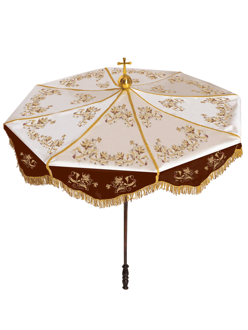 Parasol procesyjny ecru z bordowymi wstawkami i stelażem