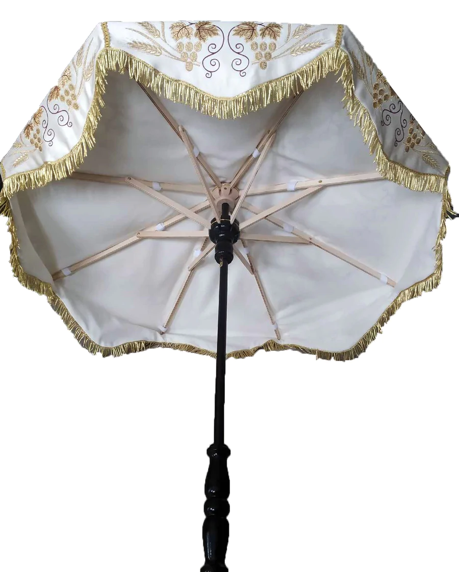Parasol wykonany z dbałością z wysokiej jakości tkaniny (100% PE). Posiada ozdobny haft wykończony złotą nicią.