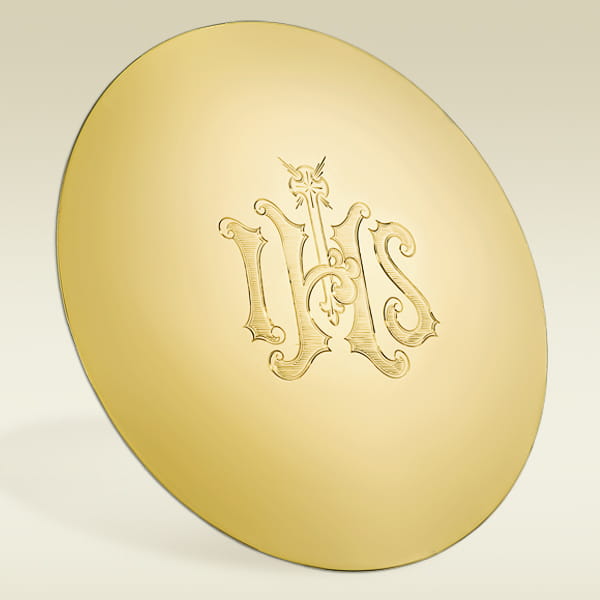 Wysokiej jakości produkt polski. Patena mosiężna złocona 24-karatowym złotem.