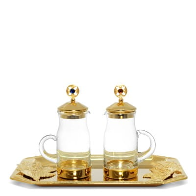 Ampułki liturgiczne z tacką pozłacaną z poręcznym uchwytem . Pojemność  130 ml