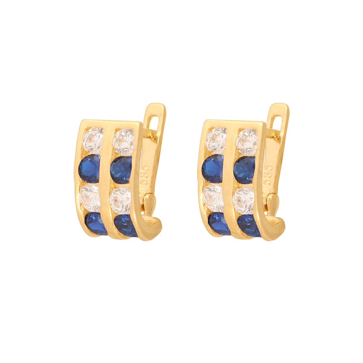 Delikatne kolczyki o falowanym kształcie z cyrkoniami i kamieniami w kolorze szafiru.