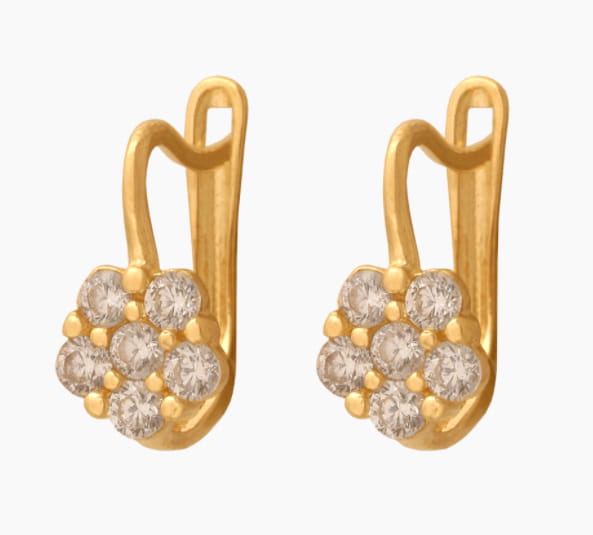 Kolczyki złote z tzw. angielskim zapięciem, zdobione cyrkoniami.