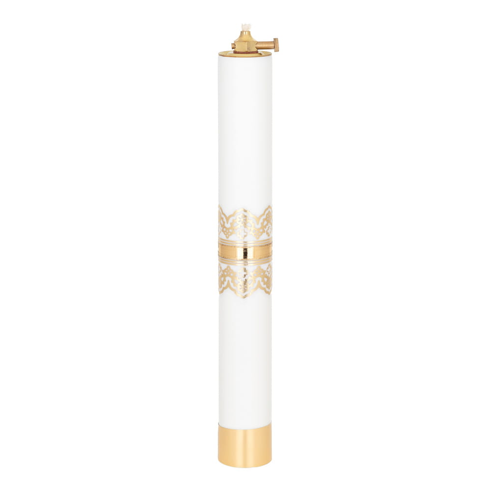 Starannie wykonana biała, plastikowa świeca z aplikacją w kolorze złotym.