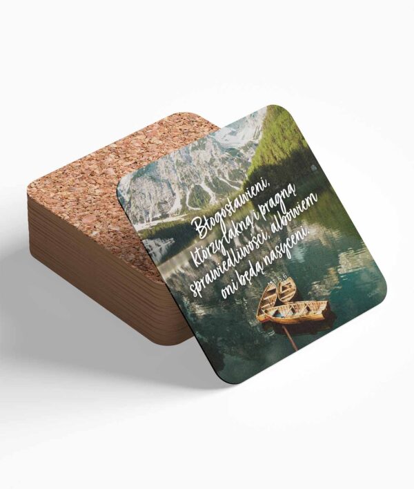 Podstawka zawiera tekst biblijny "Błogosławieni, którzy łakną i pragną sprawiedliwości, albowiem oni będą nasyceni"