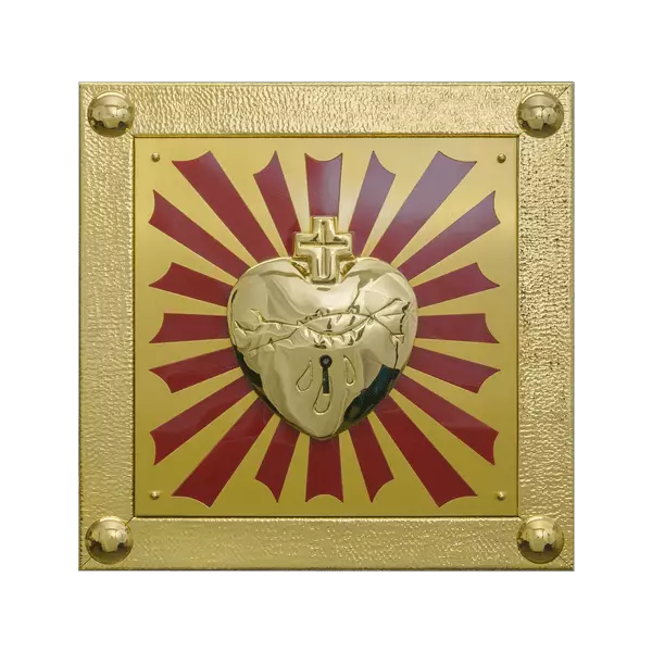 Mosiężne tabernakulum z metalowymi okuciami, zdobione sercem z podświetlanymi promieniami - LED.