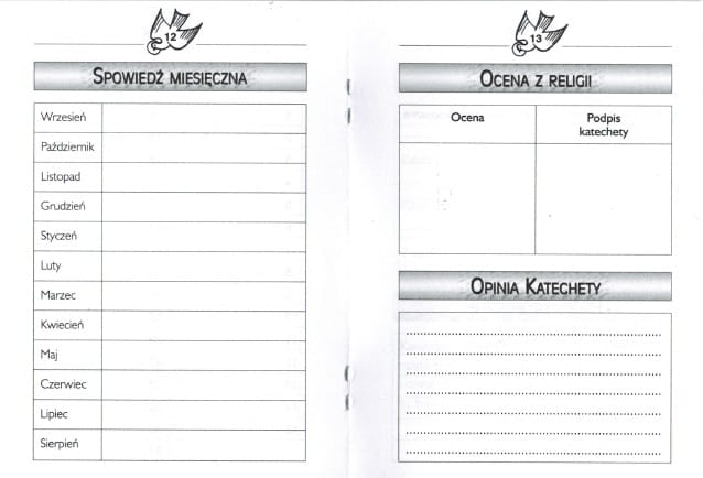 Dzienniczek kandydata do bierzmowania ilustruje roczny okres przygotowań do tego sakramentu. Przedstawia czytelny obraz uczestnictwa kandydata w życiu wspólnoty parafialnej, jego uczestnictwo we Mszy św. I nabożeństwach, zawiera także arkusze ocen i miejsce na opinie katechety.