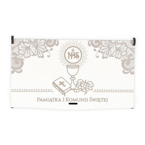 W środku zawiera kartkę z życzeniami i miejscem na wpis.