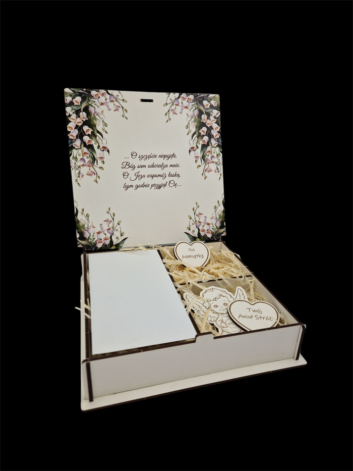 Środek podzielony na trzy części z wypełniaczem oraz piękną kolorową grafiką, znajduje się tam koperta z życzeniami, pamiątkowe serduszka, dziesiątka różańca drewniana na sznurku oraz aniołek do postawienia.