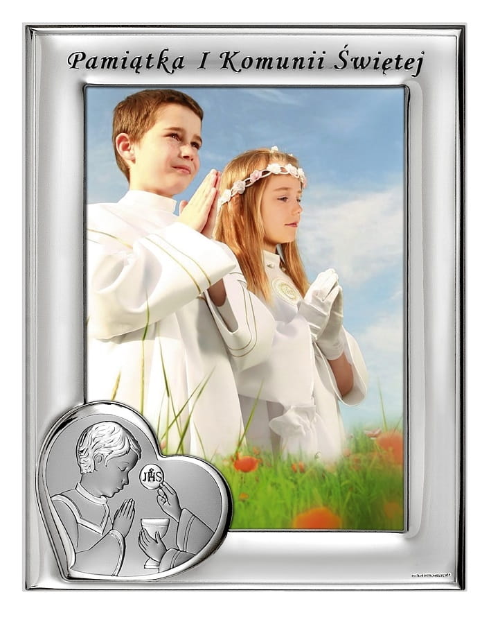 Precyzyjnej jakości wyrób. Ramka laminowana srebrem. Doskonały pomysł na prezent dla dziecka przystępującego do I Komunii Św.