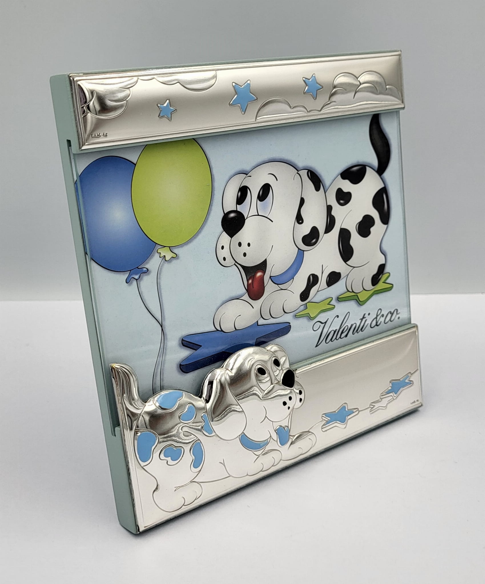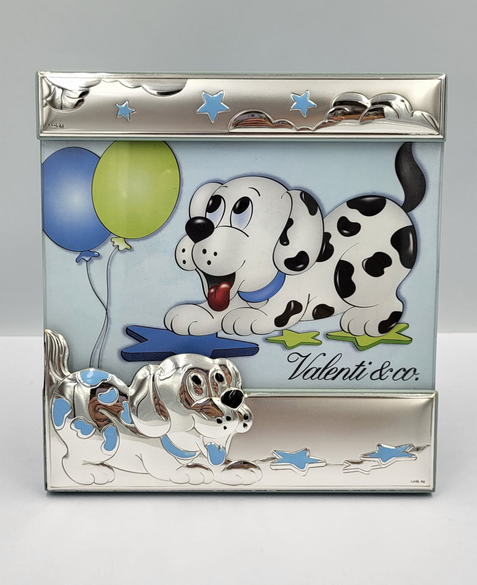 Ramka posiada ozdobne wytłoczenie srebrno - niebieskie w postaci pieska dalmatyńczyka, baloników i gwiazdek.