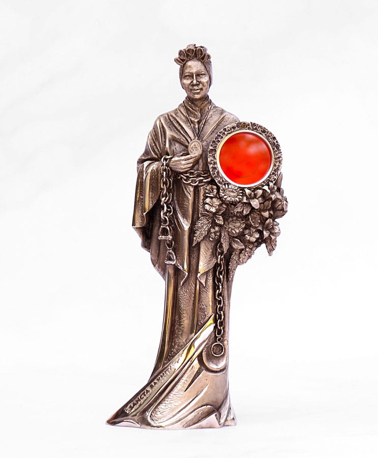 Pięknie wykonana figurka przedstawiająca św. Józefinę Bakhitę – patronkę Afryki, ofiar handlu ludźmi i przebaczenia. Rzeźba została wykonana z dużą dbałością o szczegóły – widoczne są charakterystyczne cechy świętej: habit, łańcuchy symbolizujące jej niewolę oraz medalion z wizerunkiem Matki Bożej.