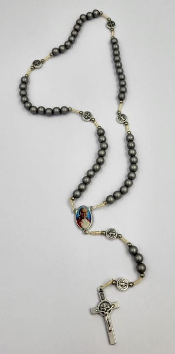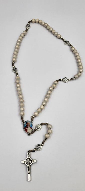 Łączniki to medale św. Benedykta (ok. 1 cm) oraz medalik z wizerunkiem Św. Jana Pawła II i Jezusa Miłosiernego (ok. 2 cm).