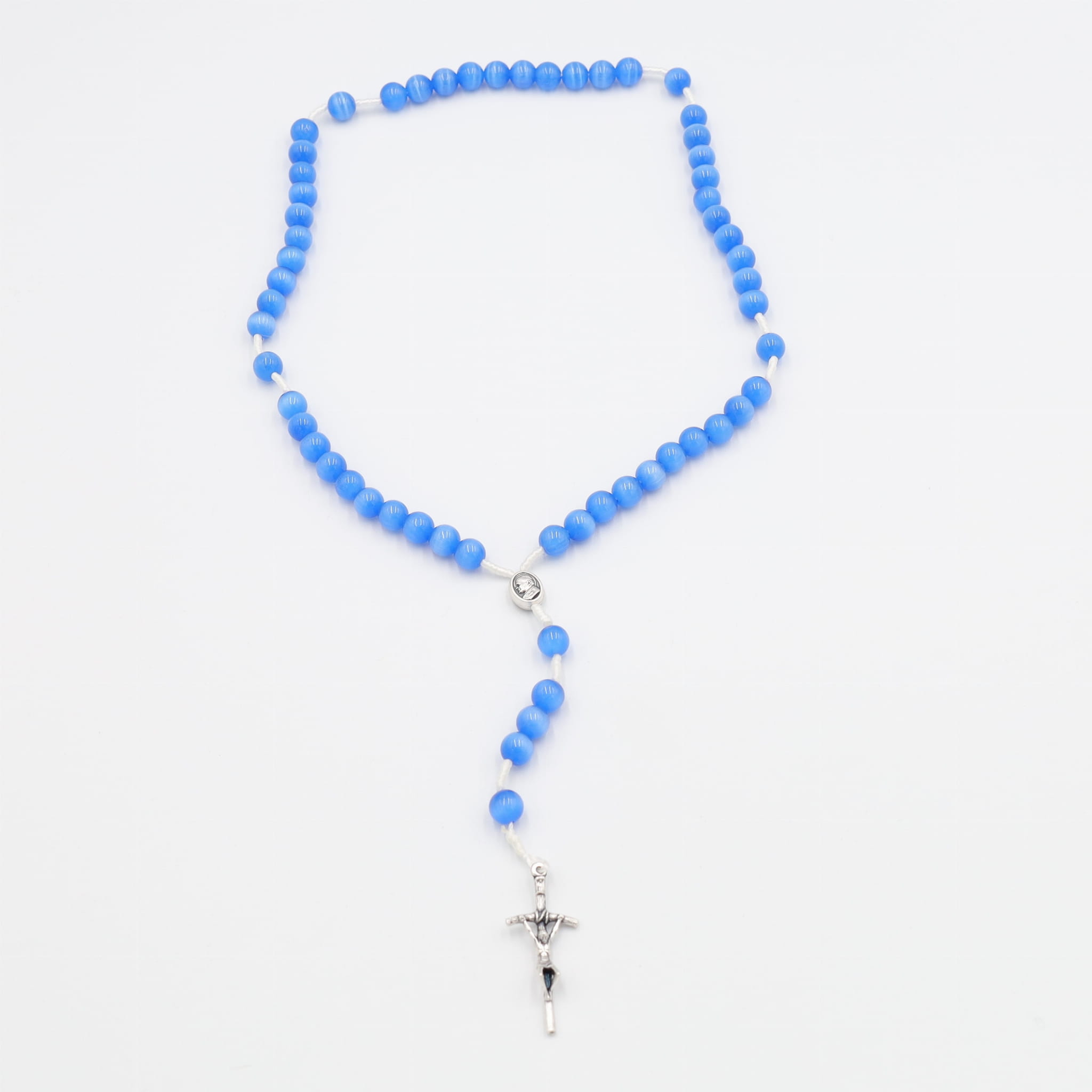 Różaniec wykonany z eleganckich, 8-milimetrowych paciorków typu kocie oko w odcieniu aqua to piękna i trwała propozycja dla osób ceniących klasyczną formę modlitwy różańcowej połączoną z estetycznym wykonaniem. Gładkie, półprzezroczyste koraliki odbijają światło charakterystycznym migotaniem, nadając różańcowi wyjątkowy, subtelny blask.