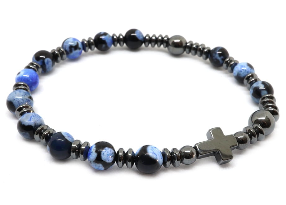 Ciekawy i praktyczny różaniec na rękę. Wykonany z 6mm agatów czarno granatowych i stalowego hematytu.