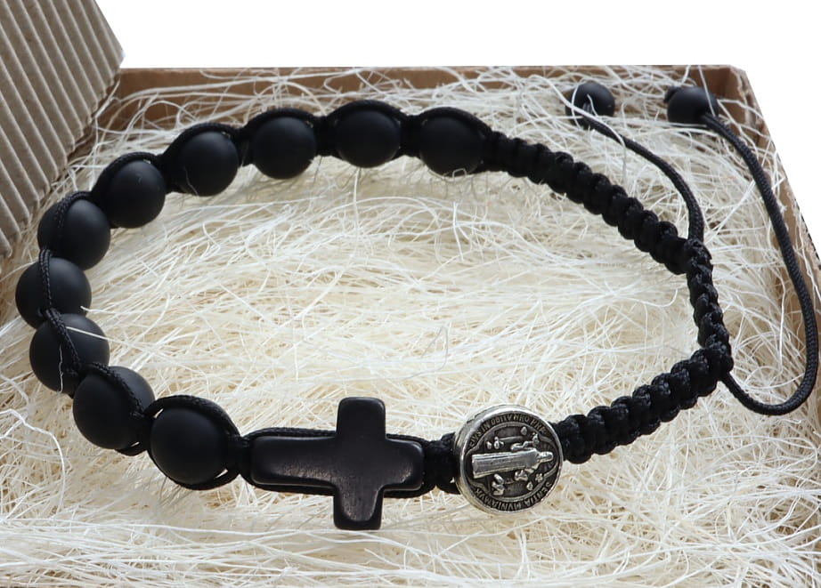 KL8463 RÓŻANIEC NA RĘKĘ, BRANSOLETKA ONYKS MATOWY Z MEDALEM ŚWIĘTEGO BENEDYKTA