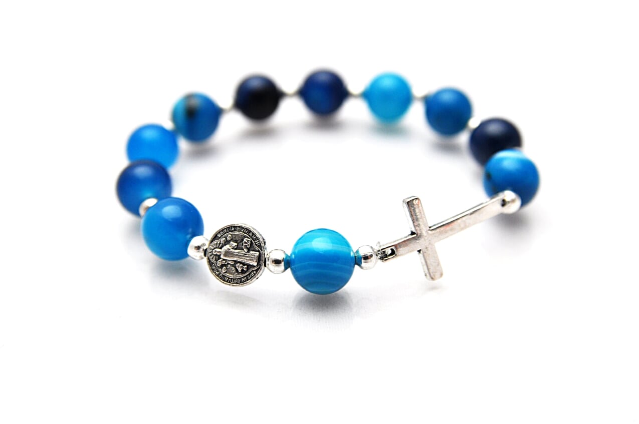 Wyjątkowa dziesiątka różańca na rękę z agatu o średnicy ok. 10 mm. Zdobiona medalem Świętego Benedykta,