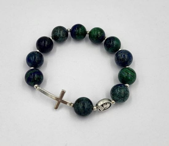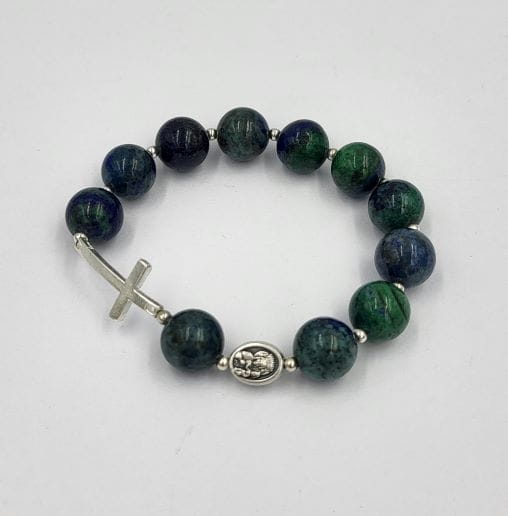 Dziesiątka różańca w formie bransoletki na rękę. Wykonana na trwałej, podwójnej gumce jubilerskiej z kamieni naturalnych - chryzokola o średnicy ok. 12 mm. Dodatkowo opatrzona medalikiem Matki Bożej Częstochowskiej oraz Jana Pawła II. Każdy różaniec pakowany w eleganckie pudełeczko.