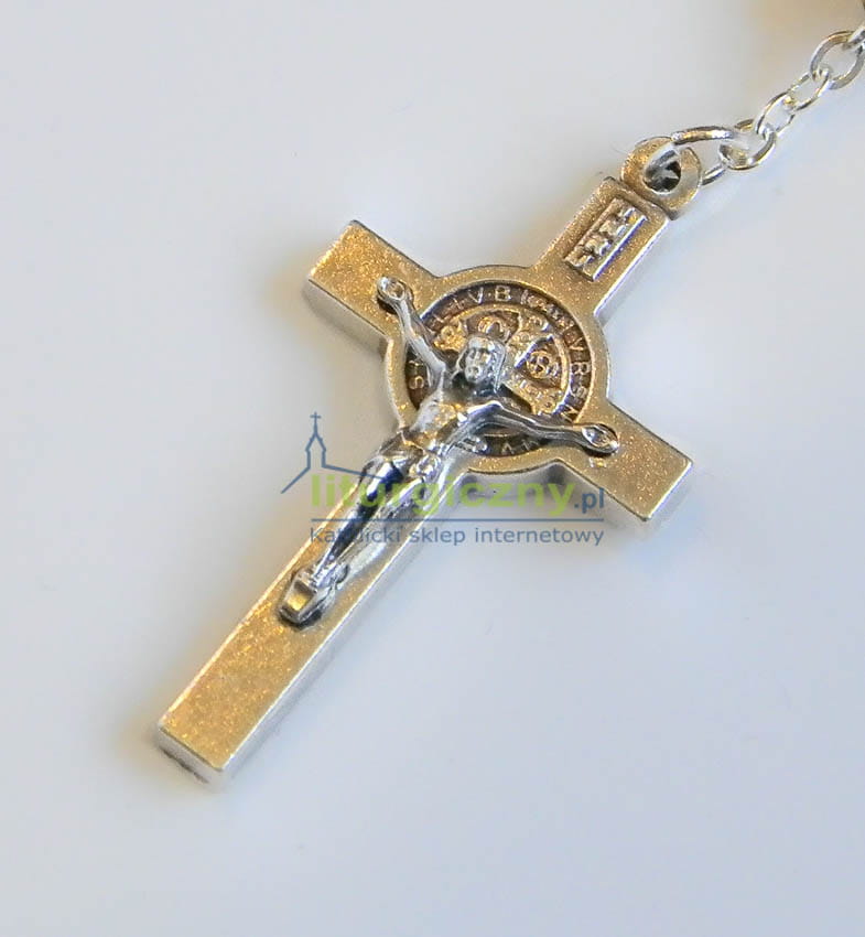 Piękny różaniec z paciorkami wykonanymi z malachitu - kamienia naturalnego o barwie zielonej do ciemnozielonej z delikatnym połyskiem. Kamienie łączone metalem oraz medalem Św. Benedykta. Różaniec zapoczątkowany krzyżem Świętego Benedykta w kolorze srebrnym. Różne łączniki.