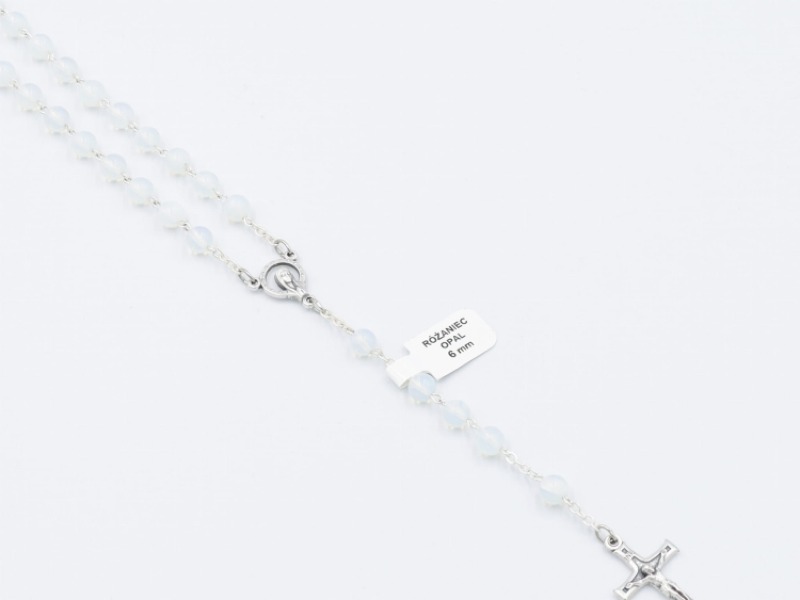Różaniec z kamieni opalitu piękny sam w sobie. Biały mieniące się kolorami i połyskujący. Koraliki nie duże, bardzo dobrze sprawdzi się też dla dziecka. Jest lekki.