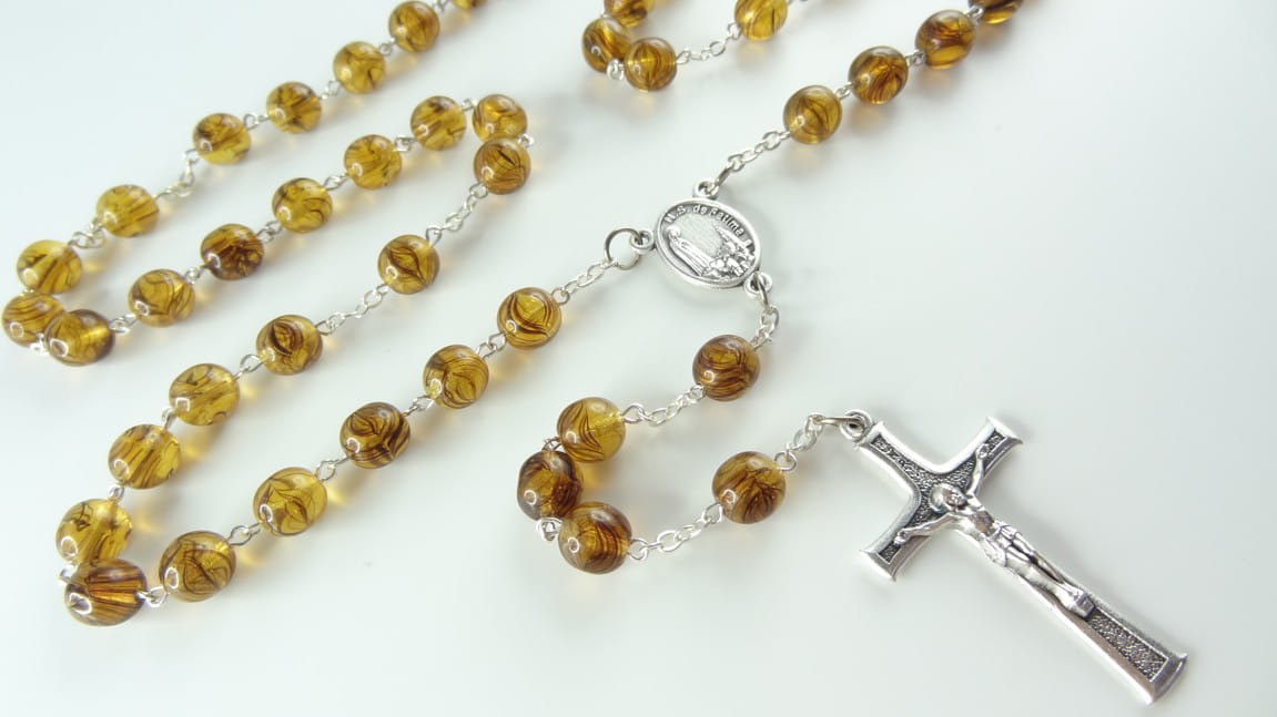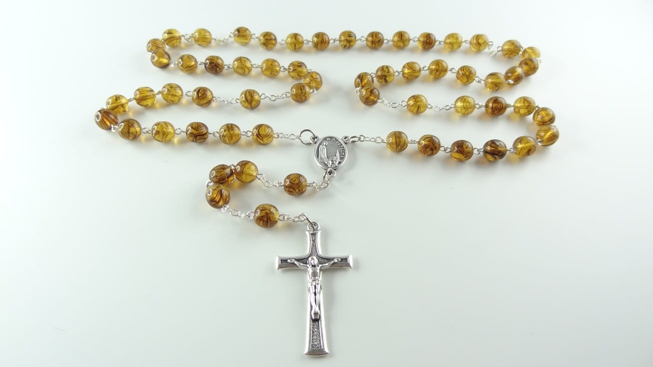 Paciorki różańca mają krystaliczną barwę z kolorem brązowym.