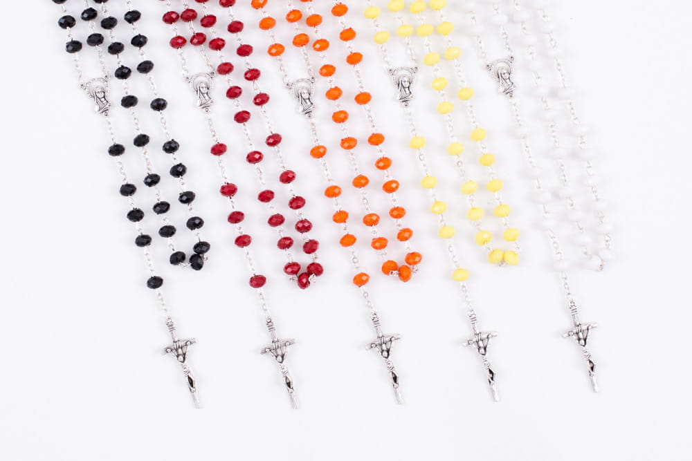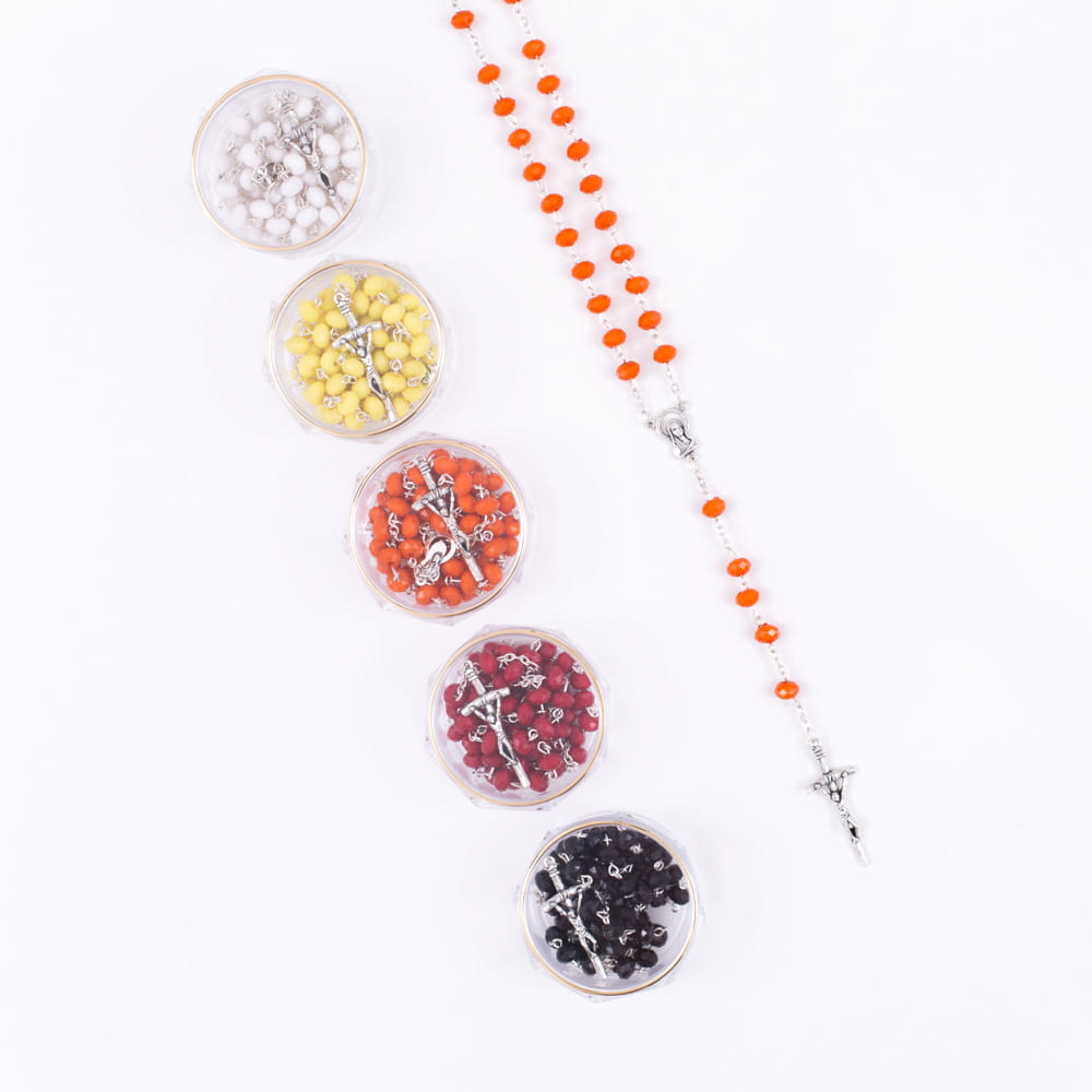 Różaniec z tworzywa sztucznego, każdy pakowany w przezroczyste, okrągłe pudełeczko.