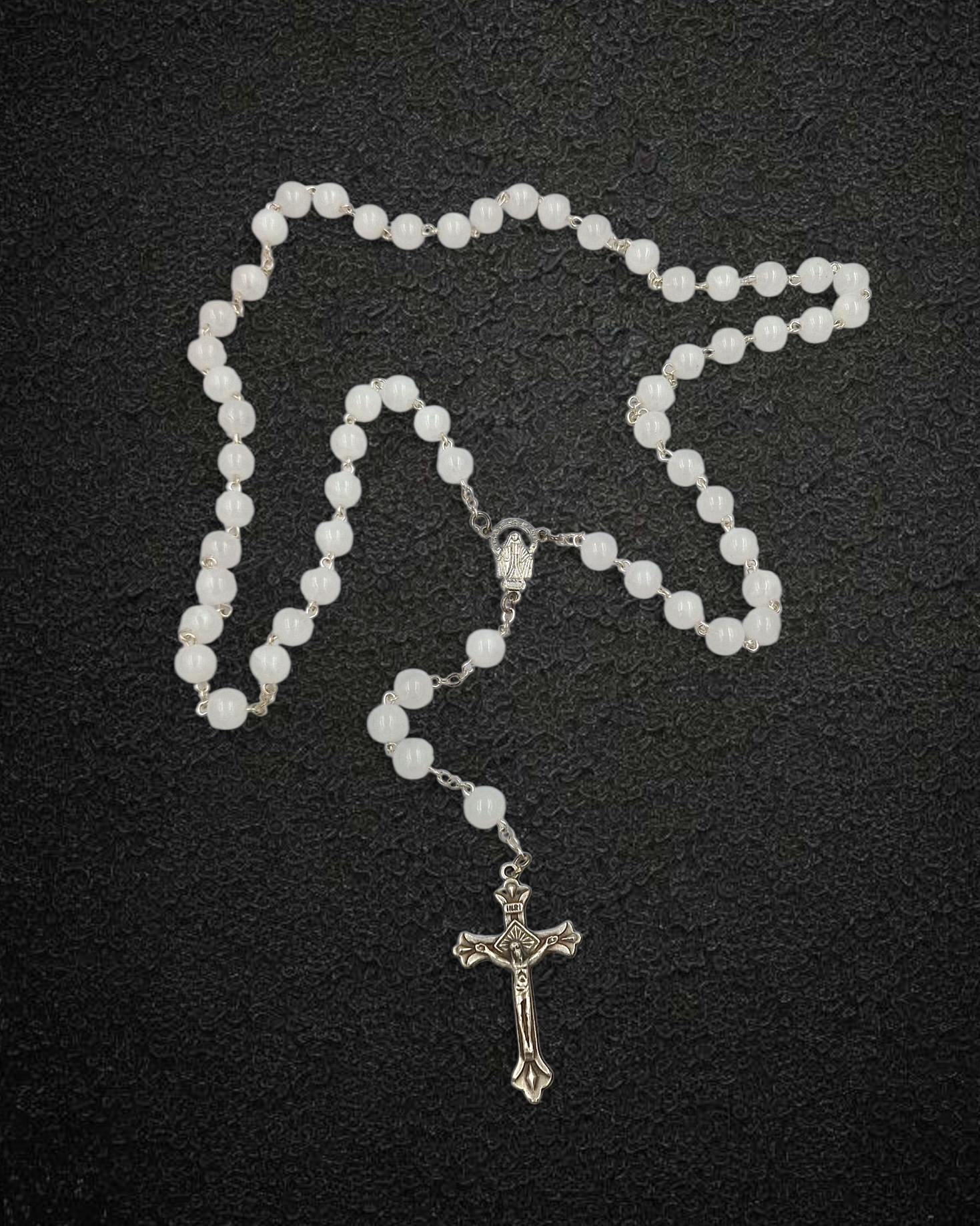 Paciorki różańca ok. 8 mm, łączone trwale metalem.