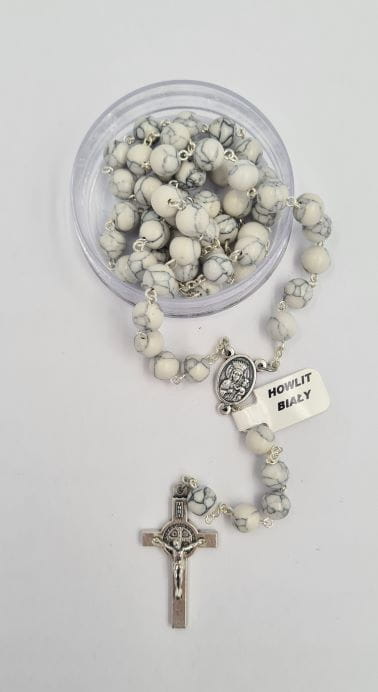 Dopracowany pod każdym względem różaniec wykonany z naturalnych kamieni jakim jest howlit - minerał dość rzadki o barwie mlecznobiałej, często poprzecinany czarnymi lub brązowymi pasami. Koronka różańca łączona metalem, z krzyżem Świętego Benedykta oraz łącznik z wizerunkiem Świętego Jana Pawła II oraz Matki Bożej Częstochowskiej.