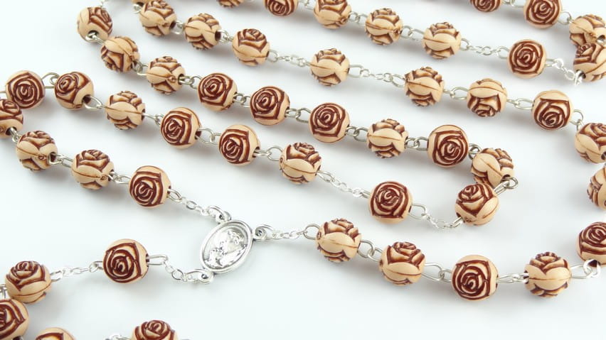 Masywny różaniec z paciorkami wielkości ok. 1 cm z motywem różyczek i krzyżem papieskim.