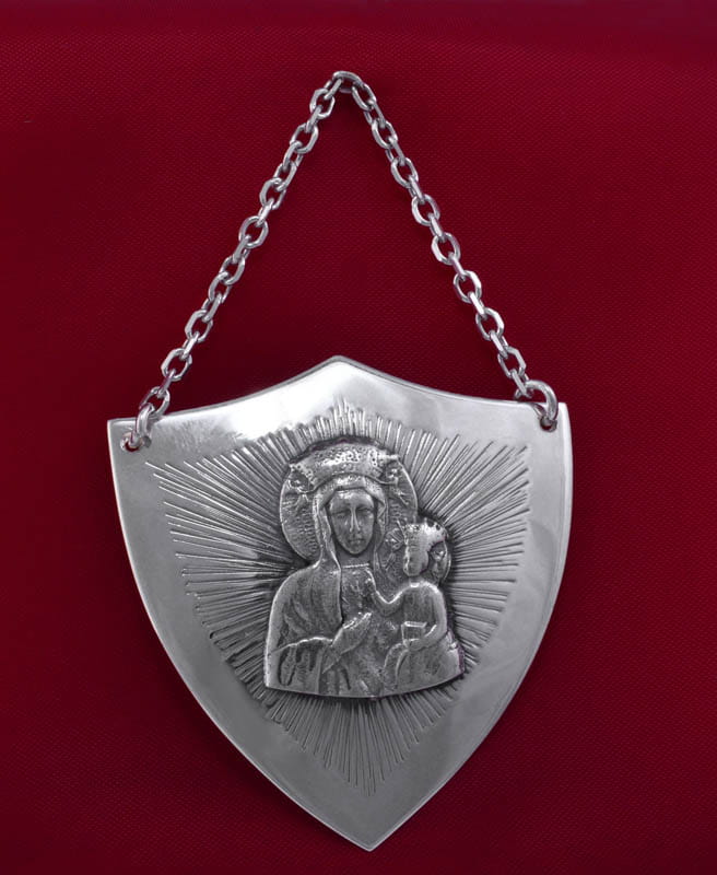 Ryngraf srebrny z wizerunkiem Matki Boskiej Częstochowskiej.