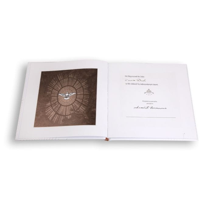 Album zawiera miejsce na dedykację i zapisanie informacji dotyczących przyjętego sakramentu. Zamieszczono w nim także rozważania i cytaty, pomagające odkryć tajemnicę Sakramentu Bierzmowania.