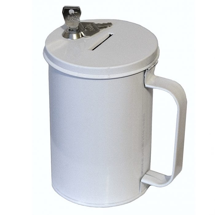 Puszka z uchwytem w formie skarbonki na kluczyk.