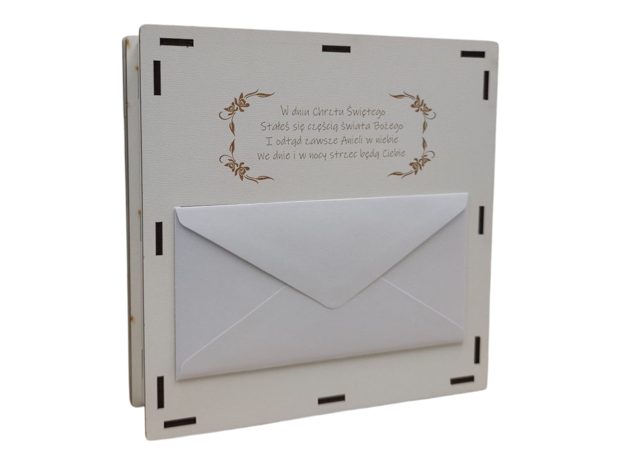 Posiada z tyłu życzenia okolicznościowe oraz kopertę. Od spodu mały otwór zamykany.