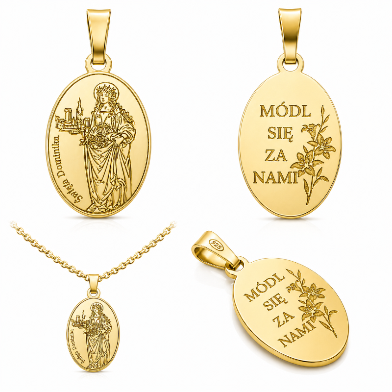 Odkryj wyjątkowy medalik ze św. Dominiką, wykonany z wysokiej jakości pozłacanego srebra próby 925, który łączy duchową symbolikę z eleganckim wykonaniem. To subtelna, dwustronna zawieszka o ponadczasowym charakterze, idealna zarówno jako osobisty znak wiary, jak i wyjątkowy prezent.