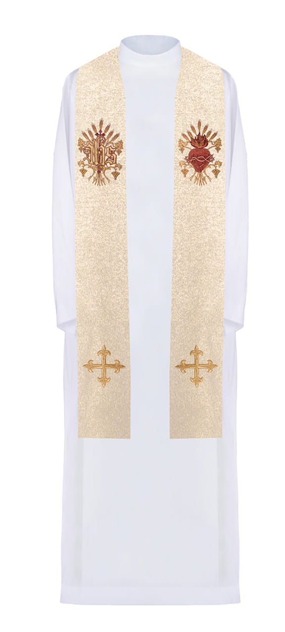 Stuła kapłańska wykonana z wysokiej jakości tkaniny gładkiej, zdobiona haftem z symbolem krzyż, IHS i serca Jezusa Chrystusa.