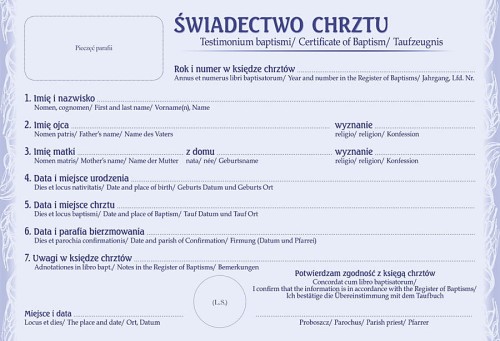 Świadectwo chrztu w języku polskim, łacińskim, angielskim, niemieckim. Druk przydatny w każdej parafii.