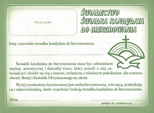 Druk będący świadectwem świadka kandydata do bierzmowania. Druki przydatne w biurze parafialnym. Sprzedaż tylko w paczkach.